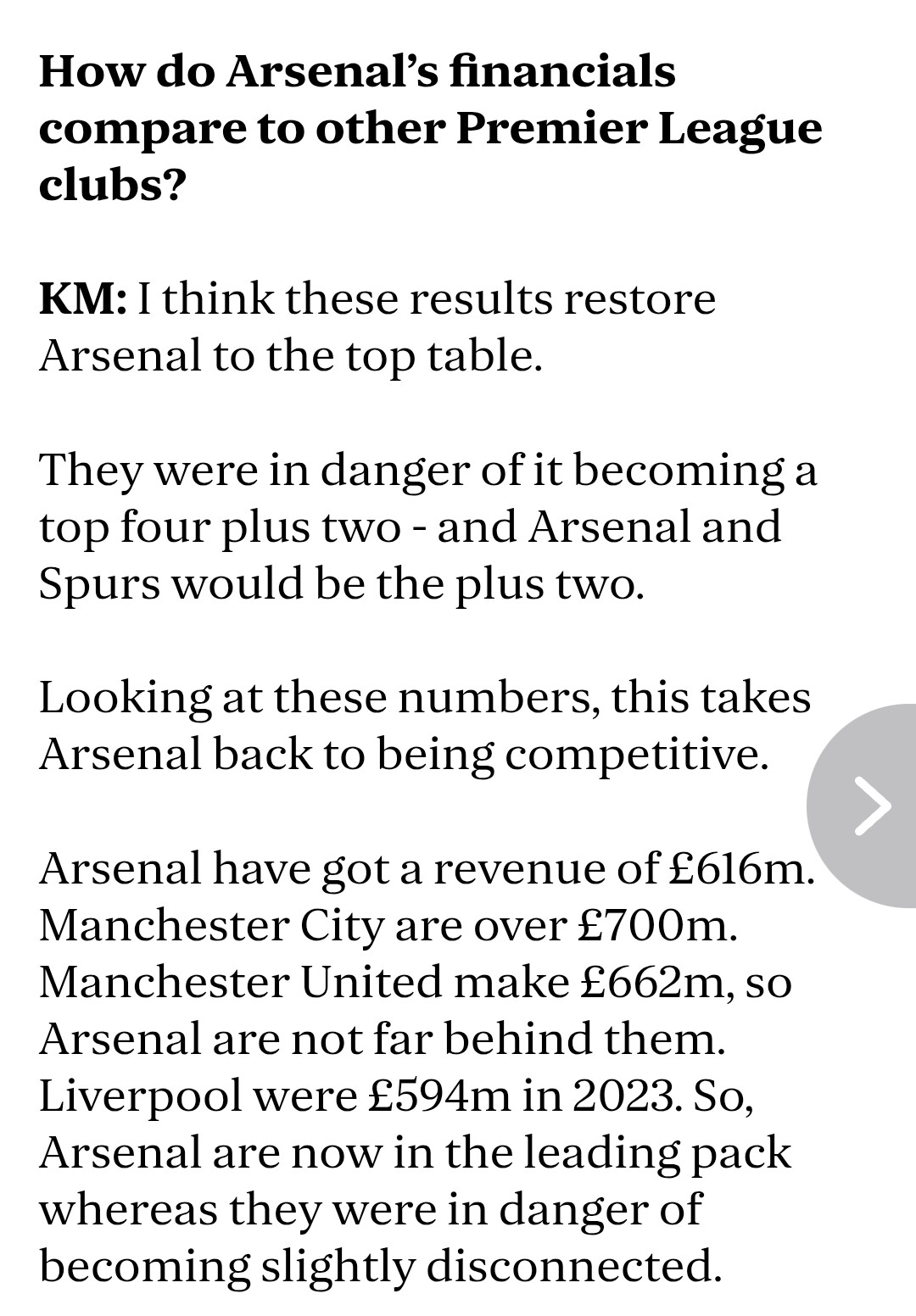 This washes with our position in the new Deloitte money league rankings that were released a few weeks ago. We haven’t been this strong financially for a very long time. Things can go up and down based on who qualifies for CL but 3rd in England and within touching distance of clubs like United, Bayern, and Barca is a huge change from where we stood three or four years ago.
