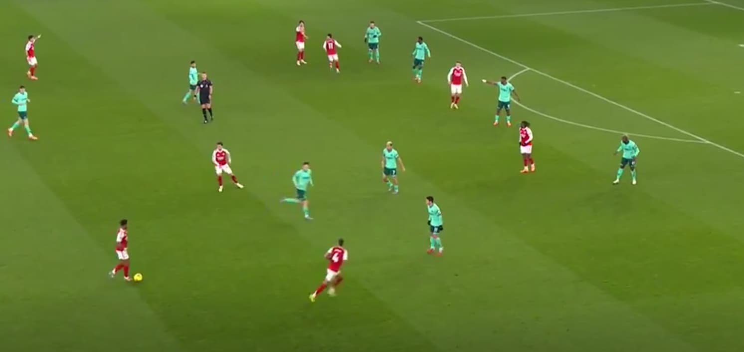 In the last image, Timber doesn’t have the ball, but it shows how much space he had to play with. The issue for me was that he shunned the centre of the pitch. He was either passing the ball to Saliba or Saka, so the pattern of play tended to fall into the dreaded horseshoe shape.