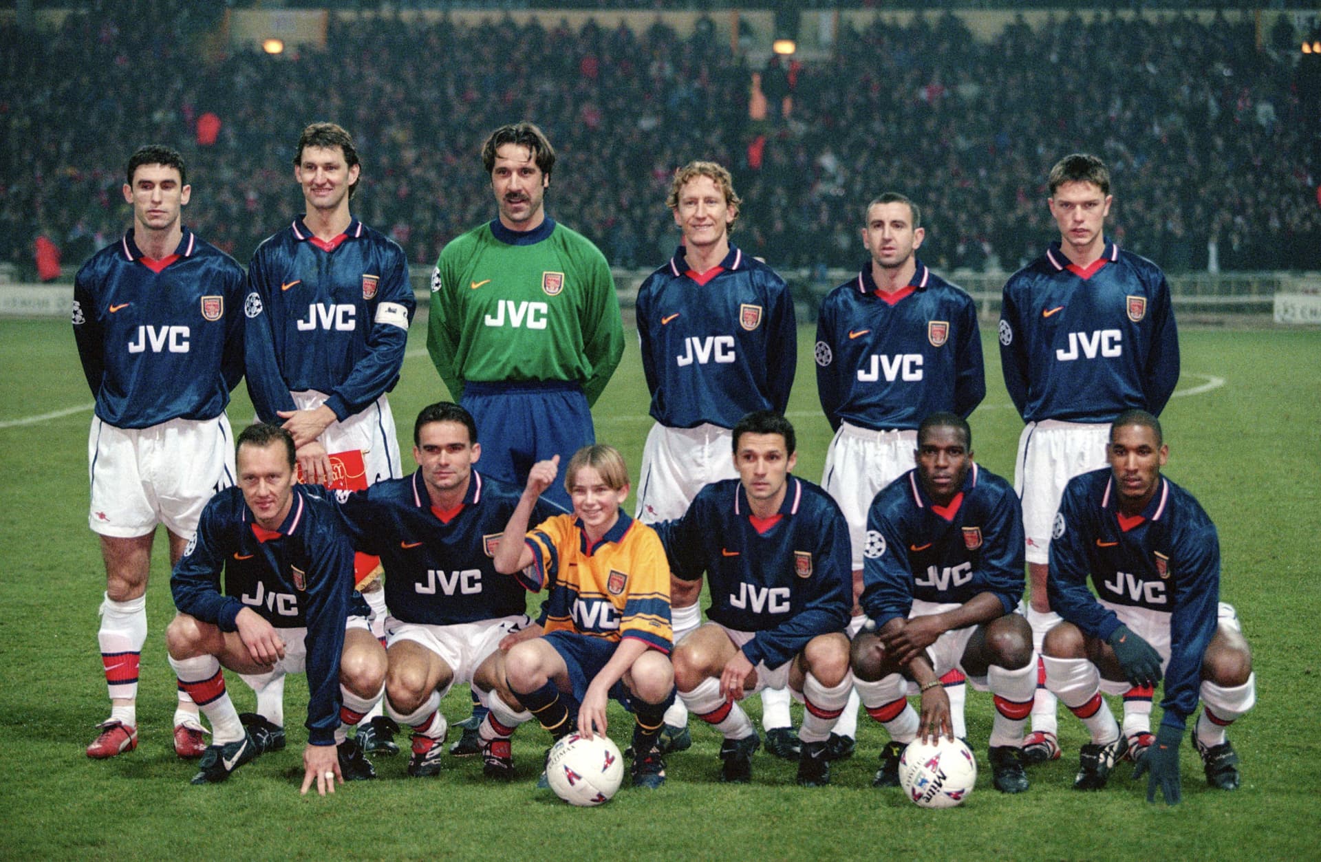 ”Gunners line up in a kit combination most fans have never witnessed before” Blue shirts with red trim, white shorts, white socks. ![]()