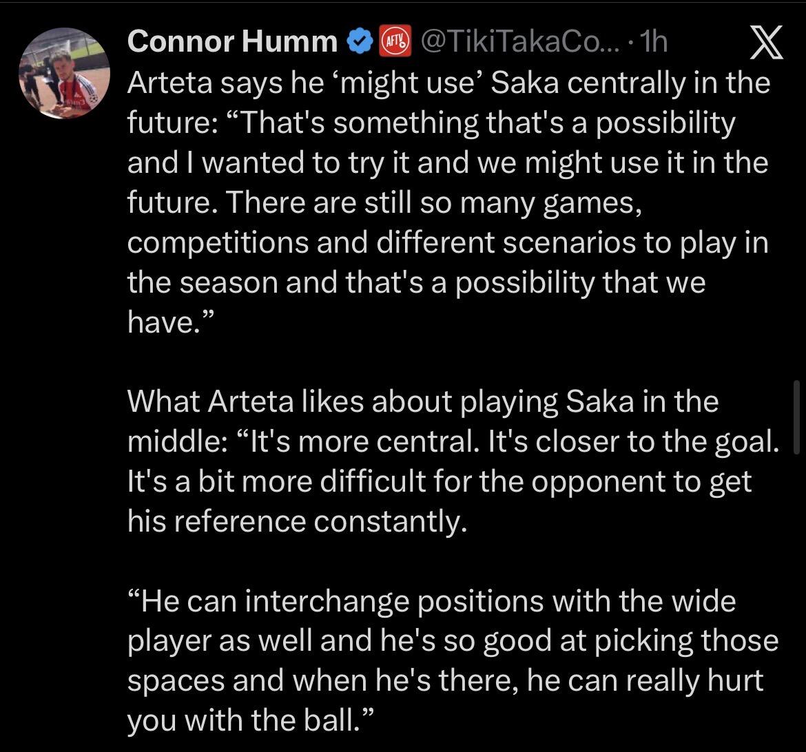 Saka played as a 10 in one game (at least) in Arteta’s first year here, iirc. That time when Ozil got kicked out, or was injured idk, and we really didn’t have much options. Looked decent.