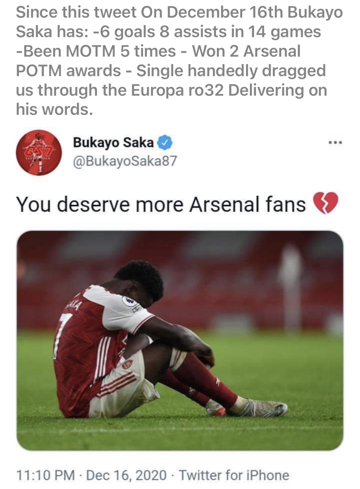 Even when Arteta initially played him there he always mentioned that the kid can do even more. I feel like most of the transitions in formation and tactics we’ve gone the past year was heavily influenced by where he could fit Saka and maximize his offensive contribution.