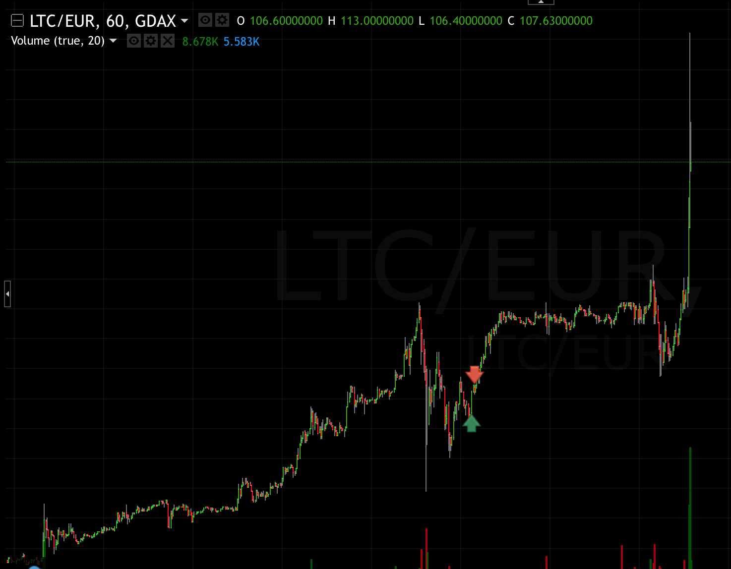 \The arrows indicate where I partially sold some of my LTC in order to buy more ETH. If LTC drops back to under a 100€ I’ll buy in again to even out.