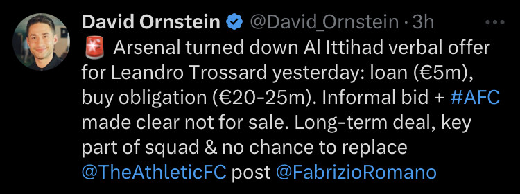 Knew Arsenal would reject the offer but was moreso worried about Trossard’s head being turned as this could be his opportunity to cash in before he enters his 30s.