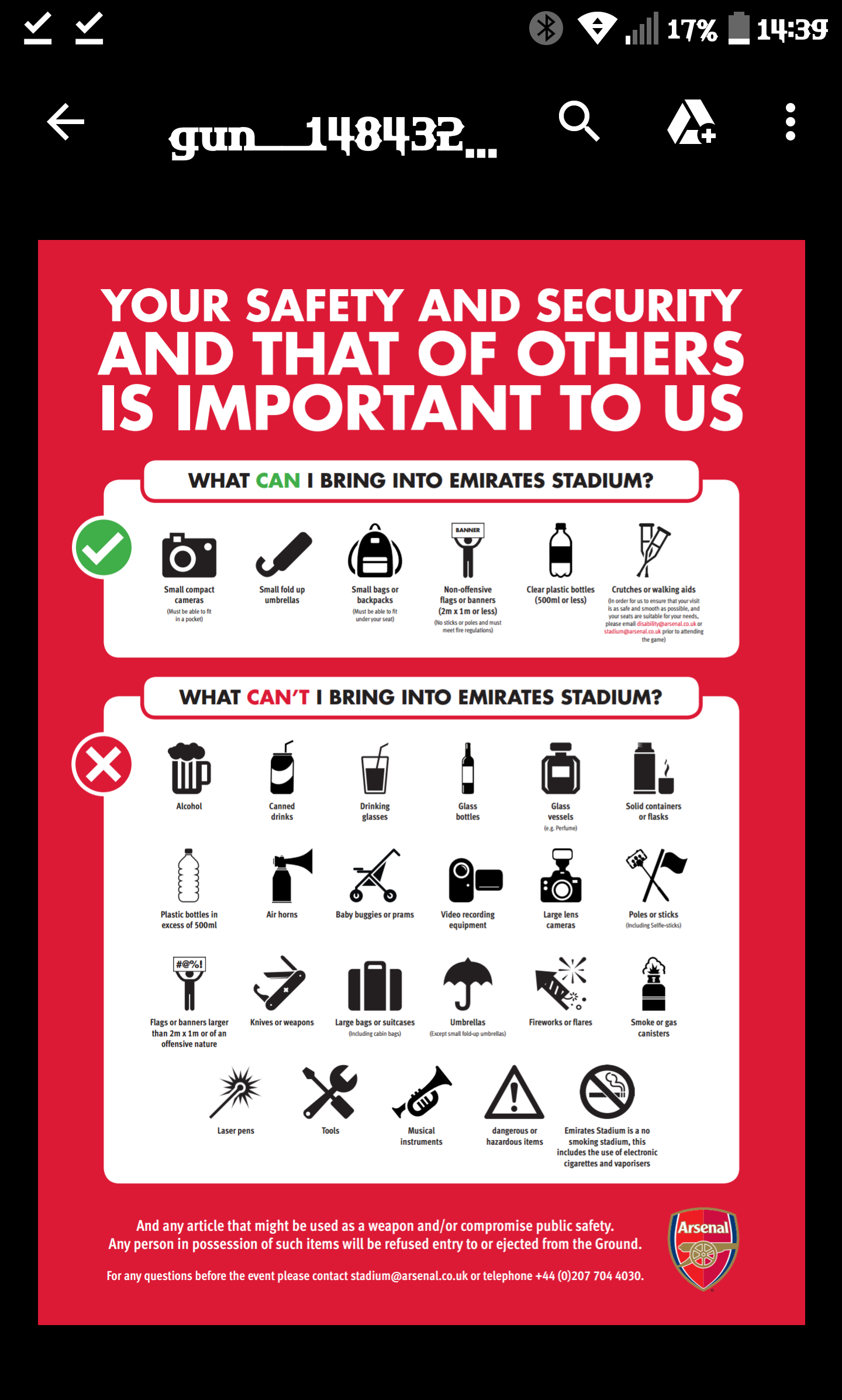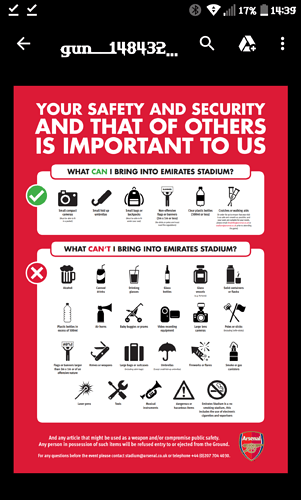 Heres the latest info from the club… http://www.arsenal.com/news/news-archive/20161018/bags-on-matchdays-at-emirates-stadium