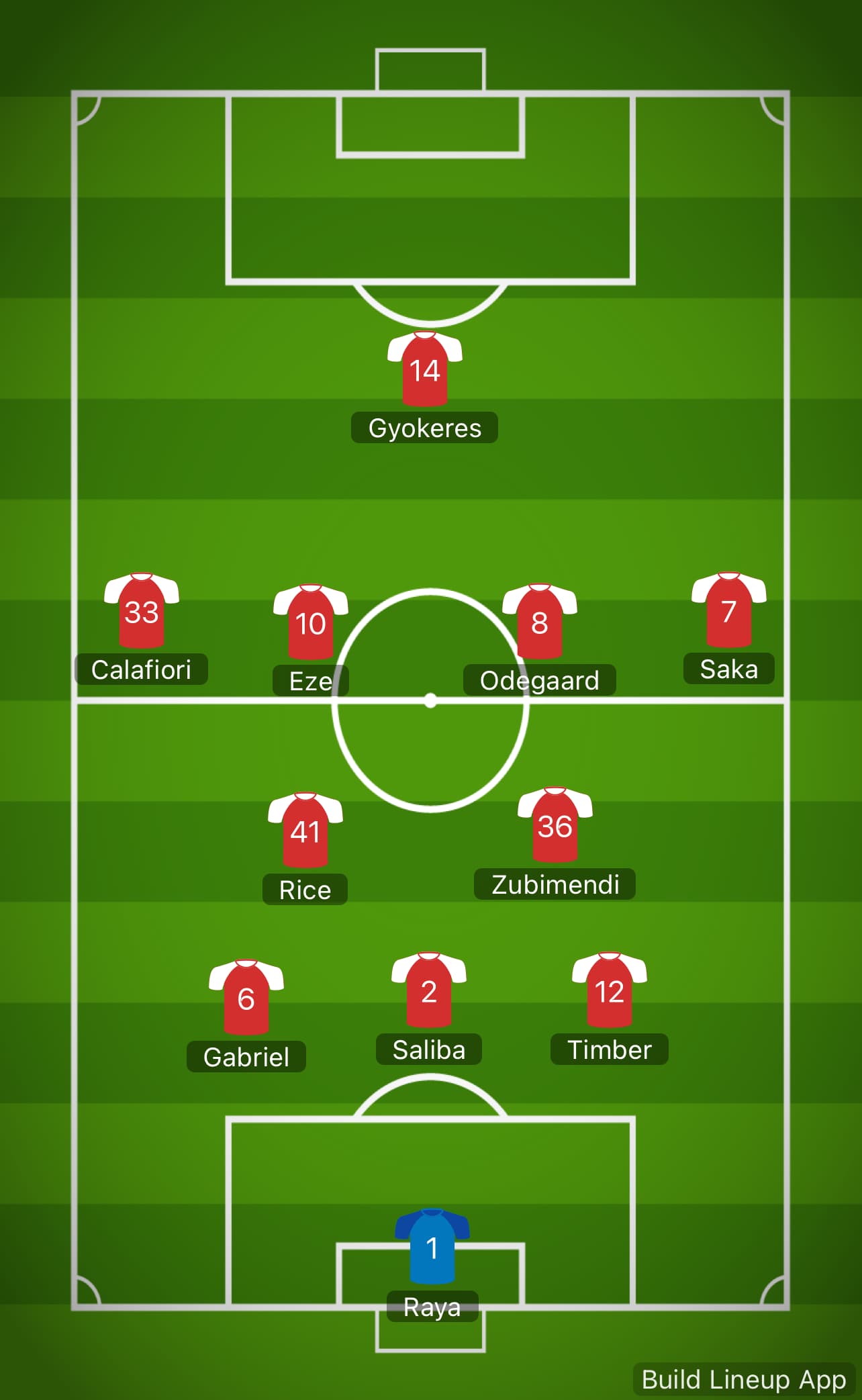 Raya - Timber Saliba Gabriel Calafiori - Zubimendi - Odegaard Rice - Saka Gyokeres Eze