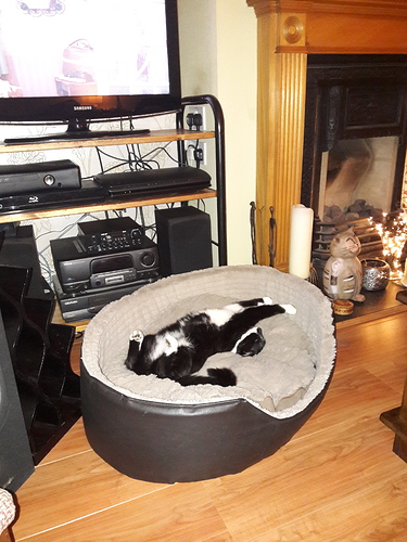 Juno fast asleep in the dog’s bed. If you refer to the OP you’ll see that even as she’s aged she’s still sleeping in ridiculous positions