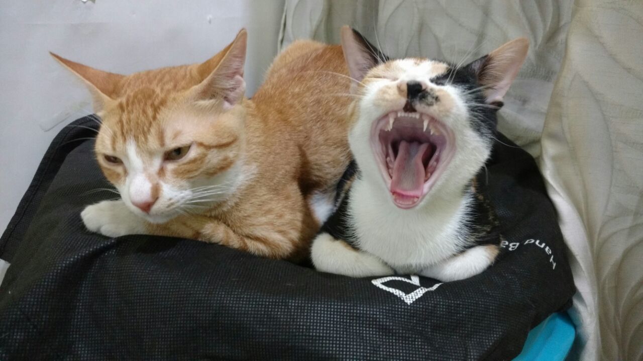 Yoda (left) now 5 months old with Gabi trying to scare the camera