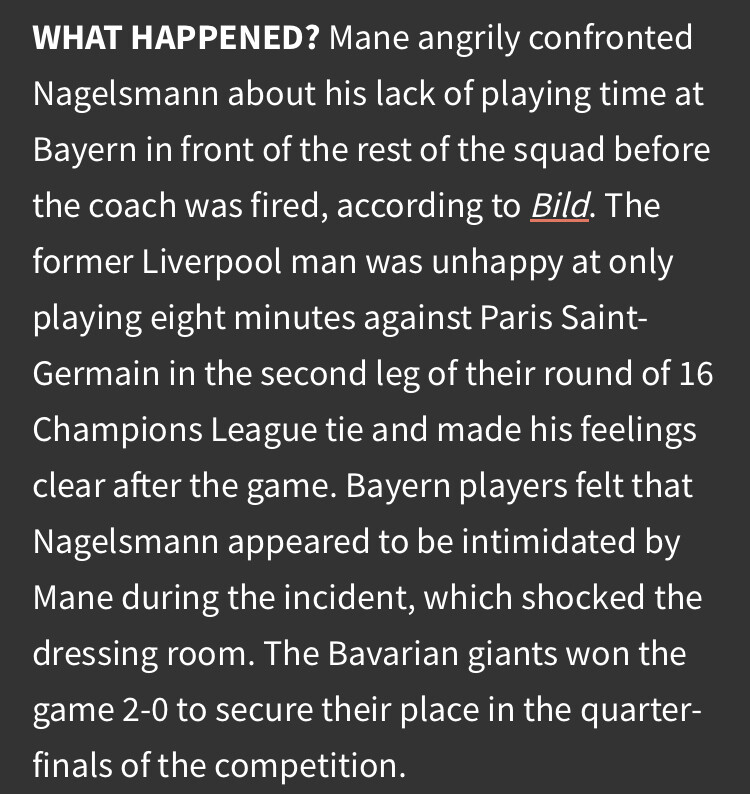 Notwithstanding the fact he punched his teammate, it’s been quite credibly reported that Mane would often display a poor application in training. Bayern bought him because of the belief he’d help raise the levels of Gnabry, Musiala, and Sane but instead had a negative impact on them.