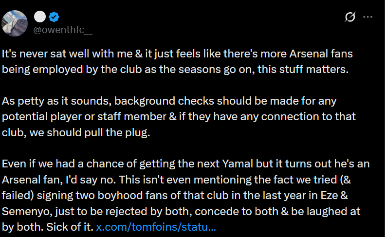 Tbh, as much as I detest Spurs, I legitimately wouldnât give a shit if one of our players/staff supported them. Id question their taste and sanity, but as long as they did their job I wouldnât give a shit lol