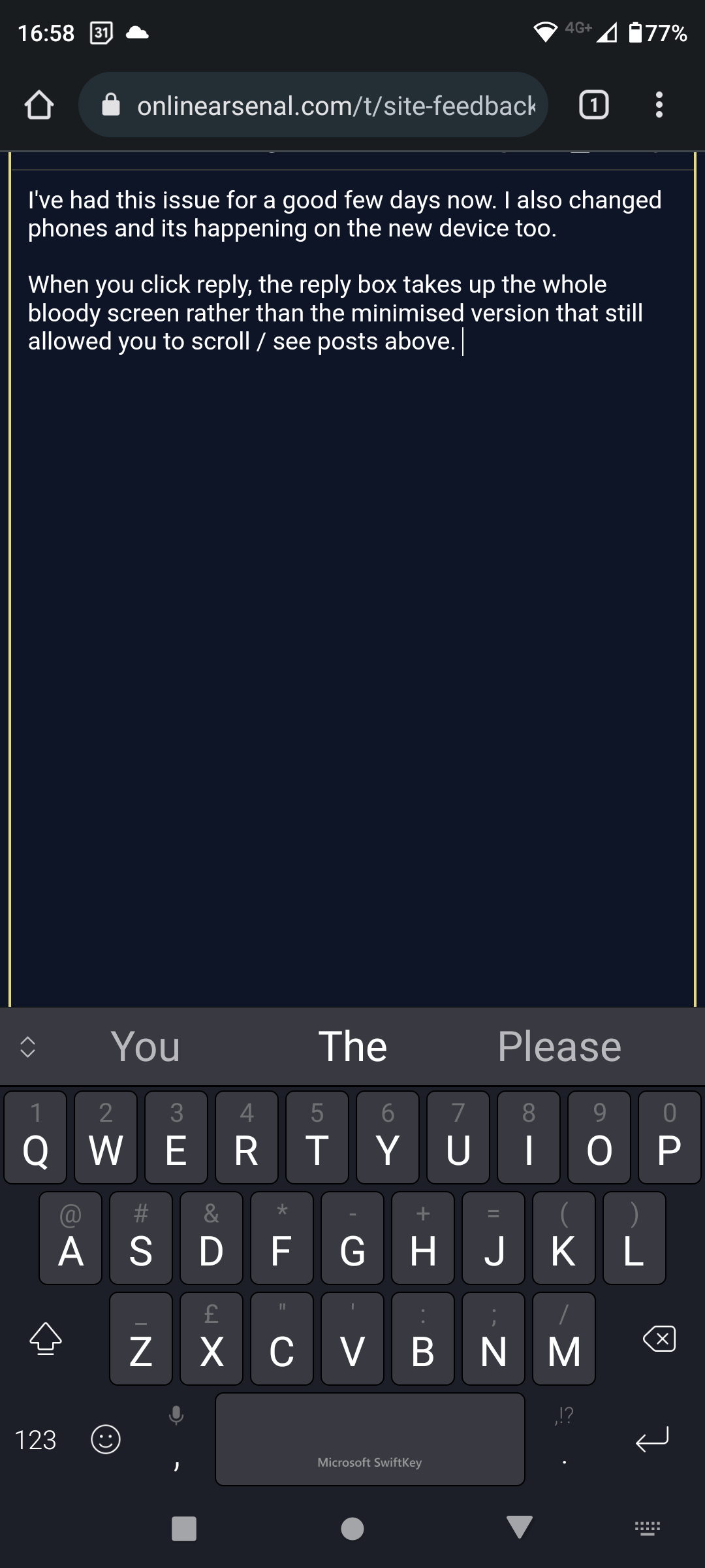 When you click reply, the reply box takes up the whole bloody screen rather than the minimised version that still allowed you to scroll / see posts above.