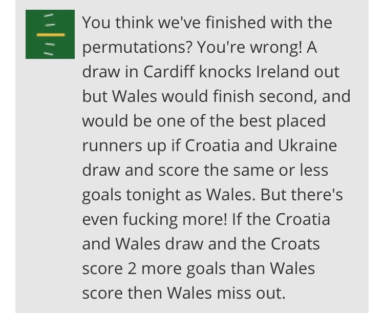 A Welsh goal would be interesting though. Just to see both teams absolutely go for it, with the goalkeepers smashing into the action before having to leg it back to their goal.