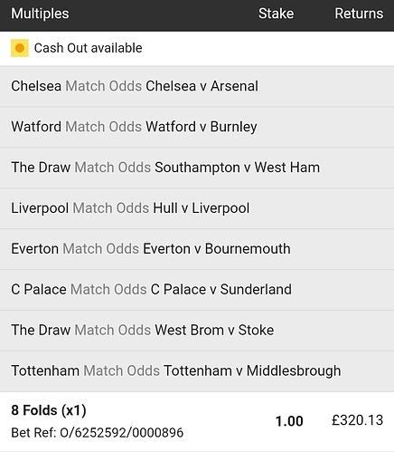 Just saw Spurs won. Had a Chelsea and Spurs win to nil double so that’s an extra 39 quid on top of the 115 earlier.