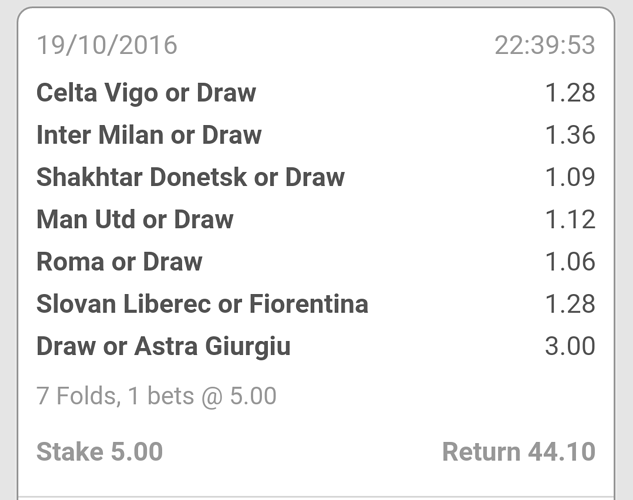 Im loving the double chances bets at the minute. My accumulators normally get ruined by a cunting equaliser or twoâŚso the double chance covers that for me. Lower odds but so much more likely to come in.