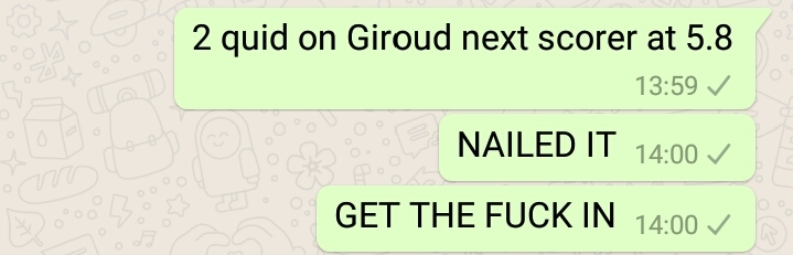 Plus me and two mates take turns to do an acca between us each weekend, a quid each and we all make two predictions. Havenât won a single one yet since we started in August haha