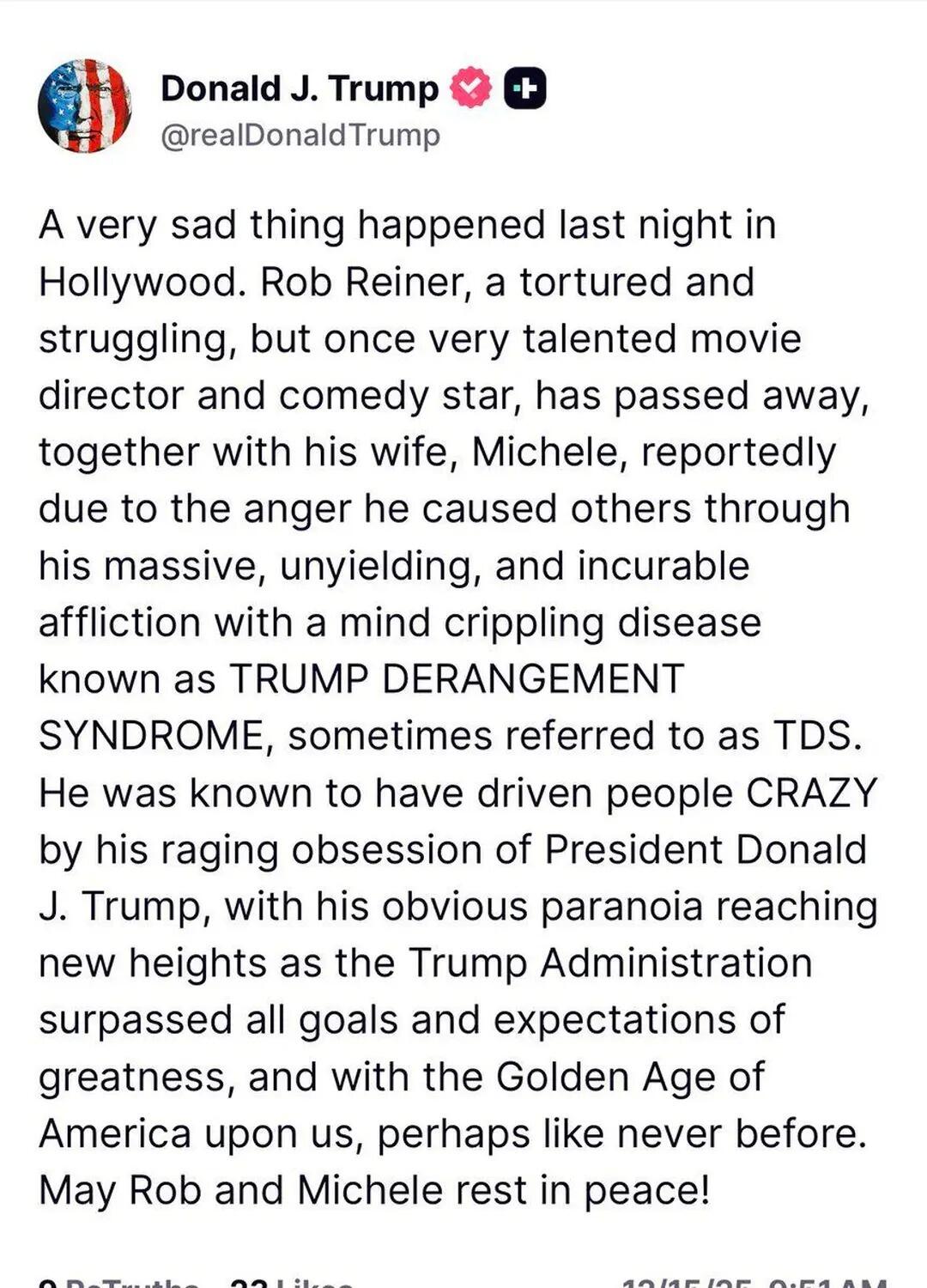 Yeah Rob Reiner was anti-Trump so Trump went off the rails and slammed him big time and then ended it with rest in peace
