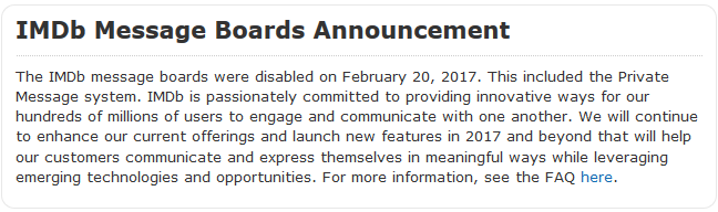 Not much of a miss… too big for moderation and a stupid amount of trolls. IMDB will be a better place without their message board.