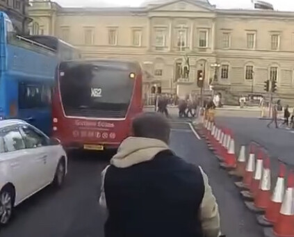 Cyclist has to admit defeat. Lights had turned amber and he’s still about 2 car lengths behind the bus. Bus driver should still show more awareness but that incident is on the cyclist