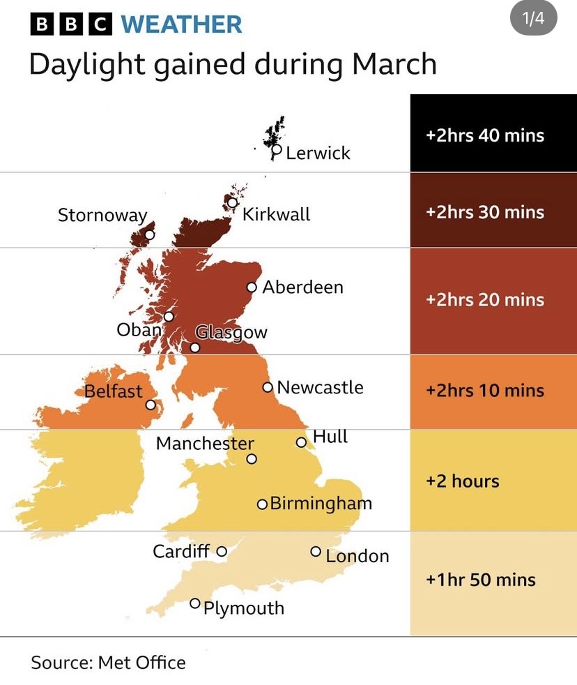 I love this part of the year as the rate of day-by-day changes in daylight is at it’s fastest when we reach the Spring equinox on 21/22 March. It then slows to a crawl by mid June.