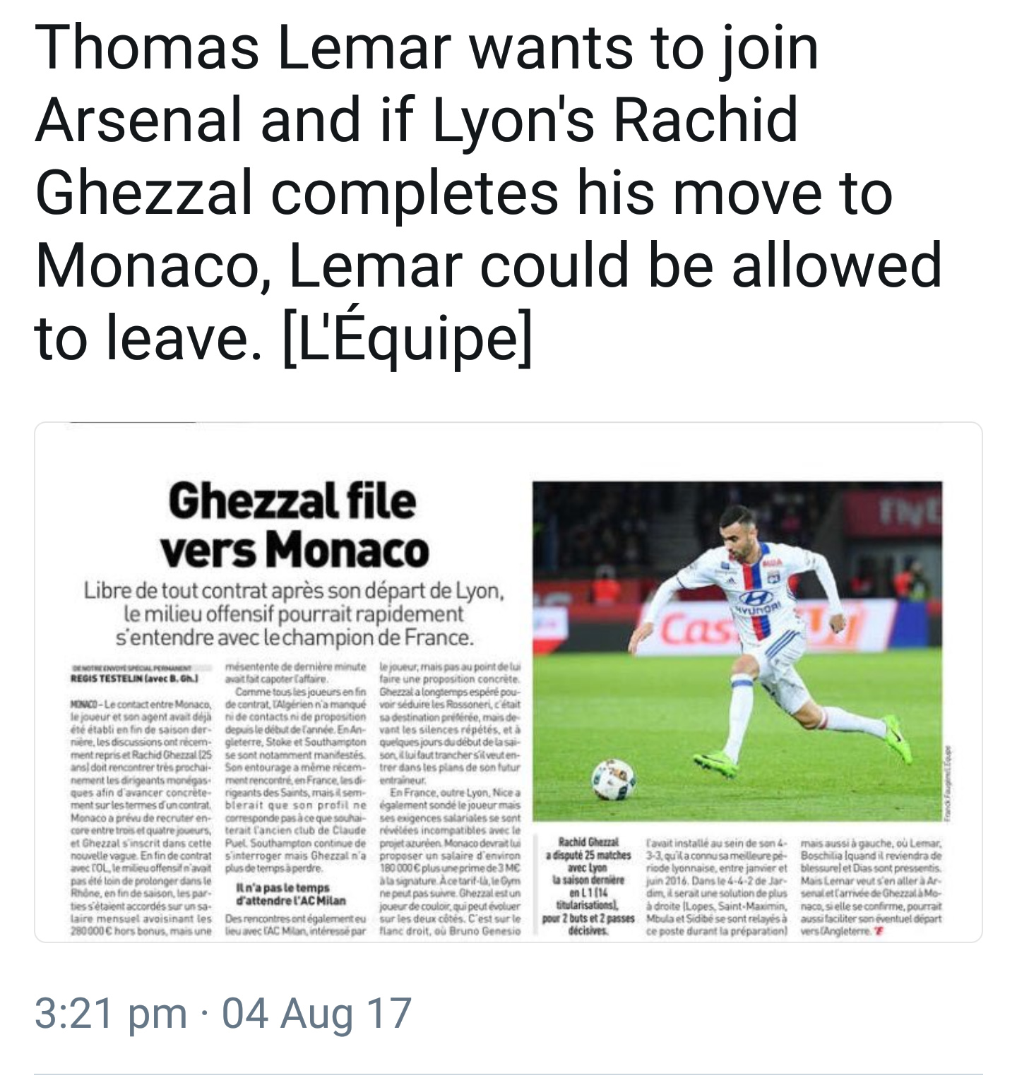 Lemar played in the French Super Cup, I doubt that if it was done and he was an Arsenal player he would be participating in that.