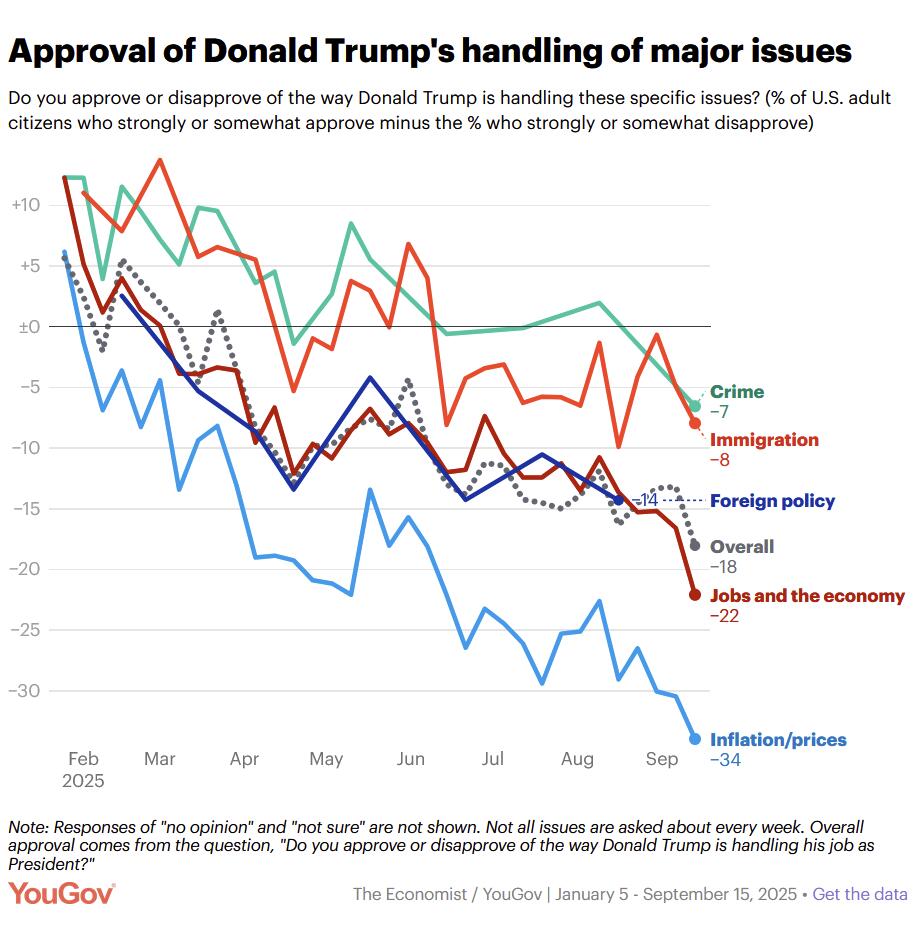 No doubt that he’s everyone’s favourite President. The funniest thing is the lowest score for the economy. This is entirely on him, his stupid tariffs and the collapse of the tourist trade.